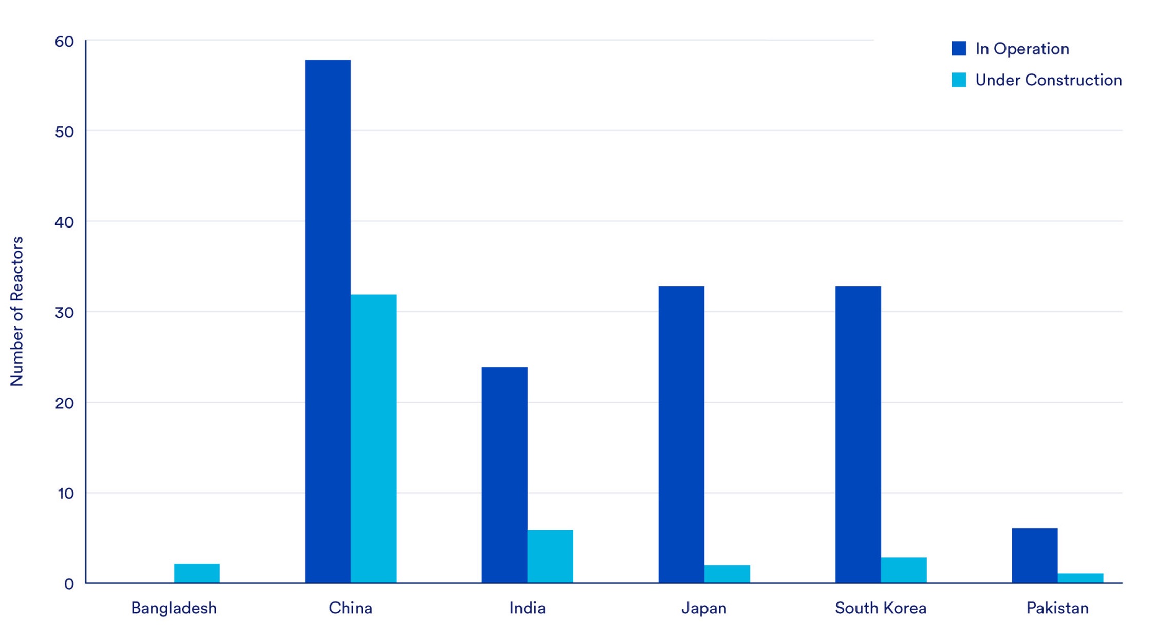 Many countries in the Asia-Pacific are now eyeing nuclear energy as a clean, firm, and dispatchable source with low variability. China has 30+ reactors under construction, more than any country in the world. Bangladesh is building its first nuclear power plant, while several countries in Central Asia and Southeast Asia have approved plans or are taking steps to build commercial nuclear energy programs.