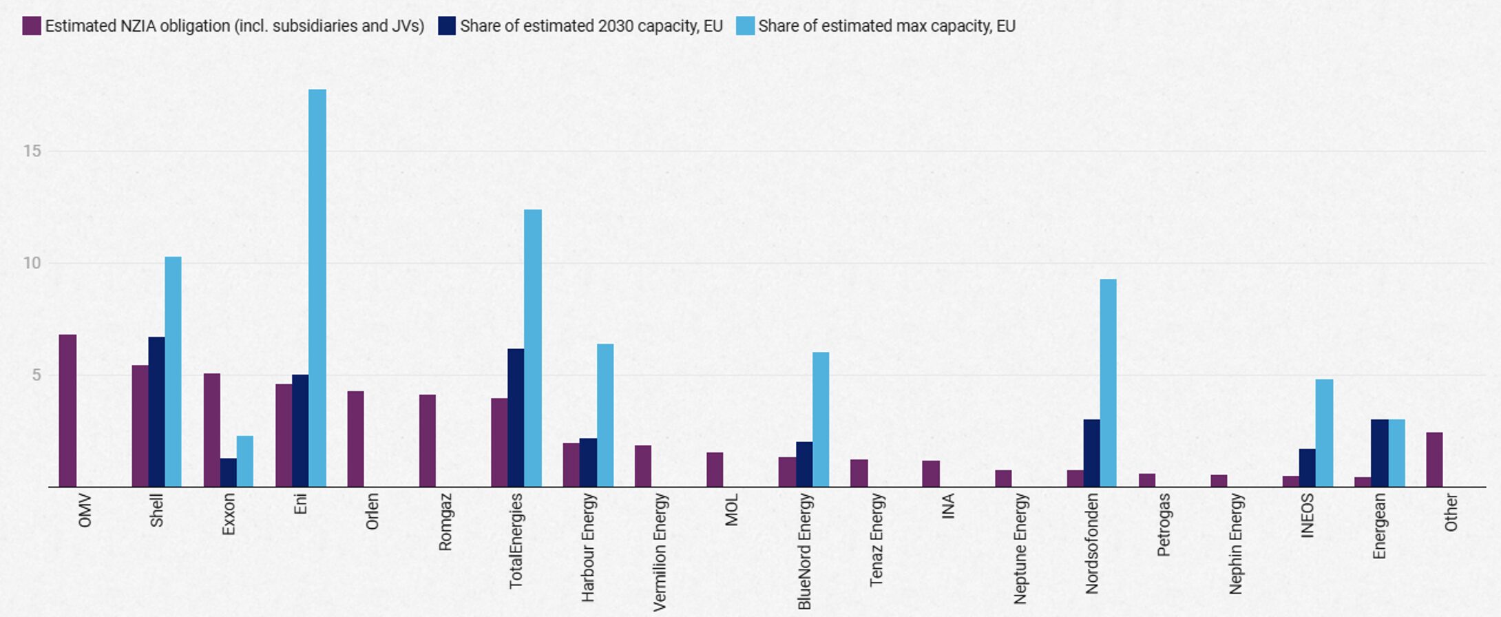 Figure 2. Estimated scale of company obligations under Article 23 of the NZIA and corresponding shares of planned storage capacity in the EU