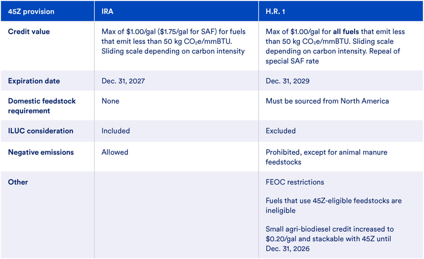 Table 2: Summary of 45Z modifications in H.R. 1 compared to the IRA