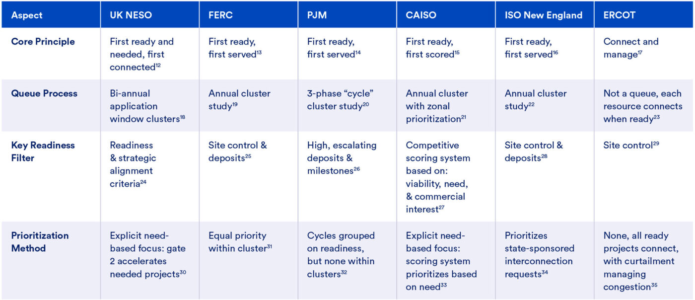 This table compares various aspects of interconnection processes. National level processes – facilitated through FERC in the U.S. and the UK’s NESO – are represented, as are several sub-national grid operators subject to FERC jurisdiction – the PJM Interconnection, New England’s Independent System Operator (ISO-NE), and the California Independent System Operator (CAISO).