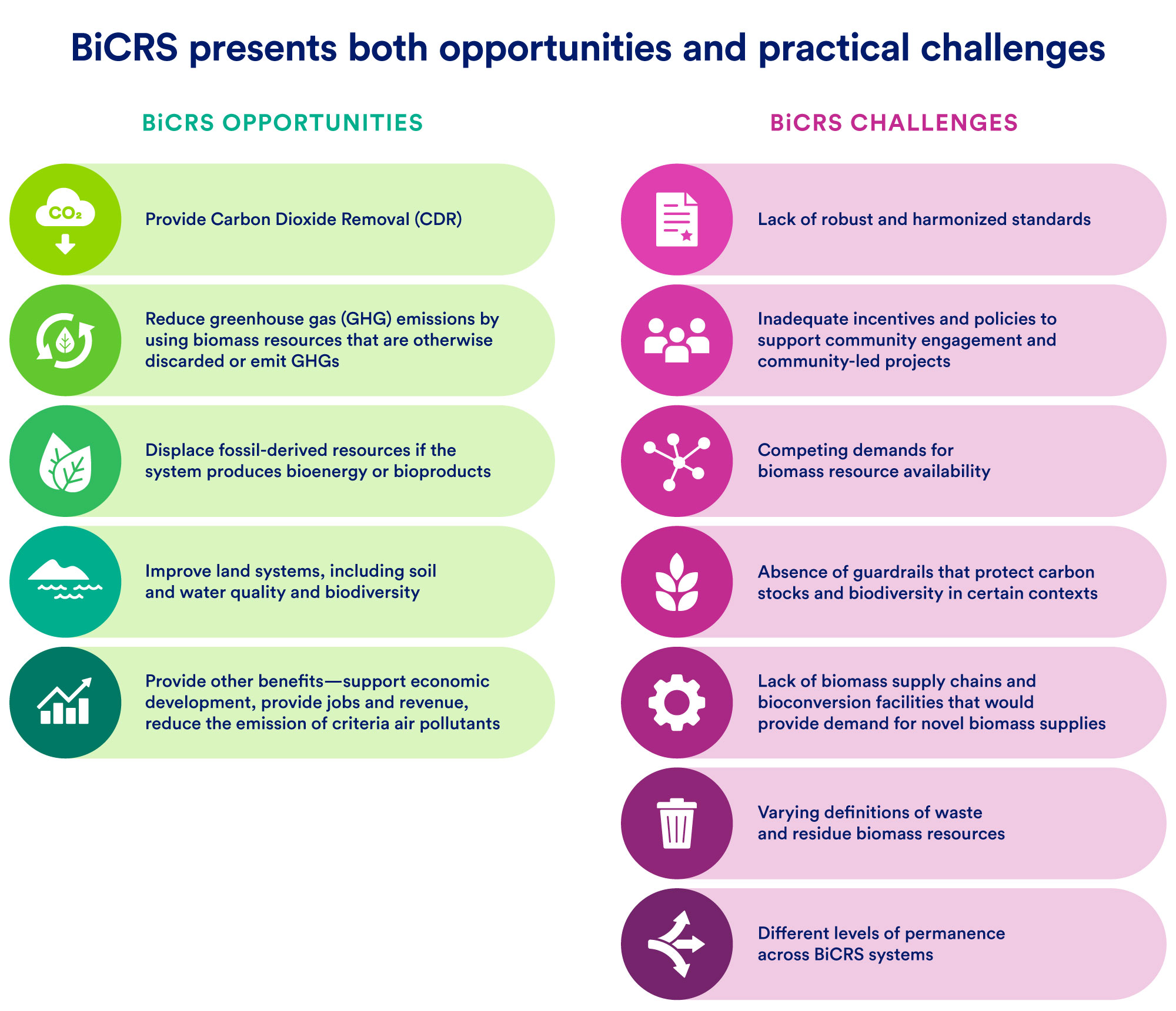 Biomass Carbon Removal and Storage (BiCRS) offers a significant opportunity to contribute to climate mitigation by removing carbon dioxide from the atmosphere, capturing emissions from biomass resources that would otherwise release greenhouse gases, displacing fossil-derived resources, and improving land systems and waste management. But many BiCRS approaches do not currently exist at scale, and the voluntary and compliance markets to support them are just emerging. Scaling BiCRS will require innovation across technologies and supply chains, backed by robust standards and effective sustainability and social safeguards.