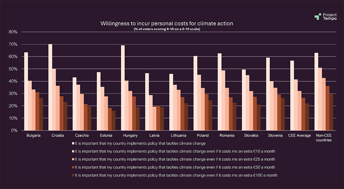Regarding attitudes towards climate and the energy transition, 62% of voters in Central and Eastern Europe acknowledge that climate change is real and driven by human activity, and most broadly support the aims of the European Green Deal (70% say climate change is a major threat for Europe). Yet, despite this general agreement on the need to address climate change, there is a clear reluctance to accept personal costs associated with these measures. CEE voters are more cost-sensitive than non-CEE voters as shown in the graph below.