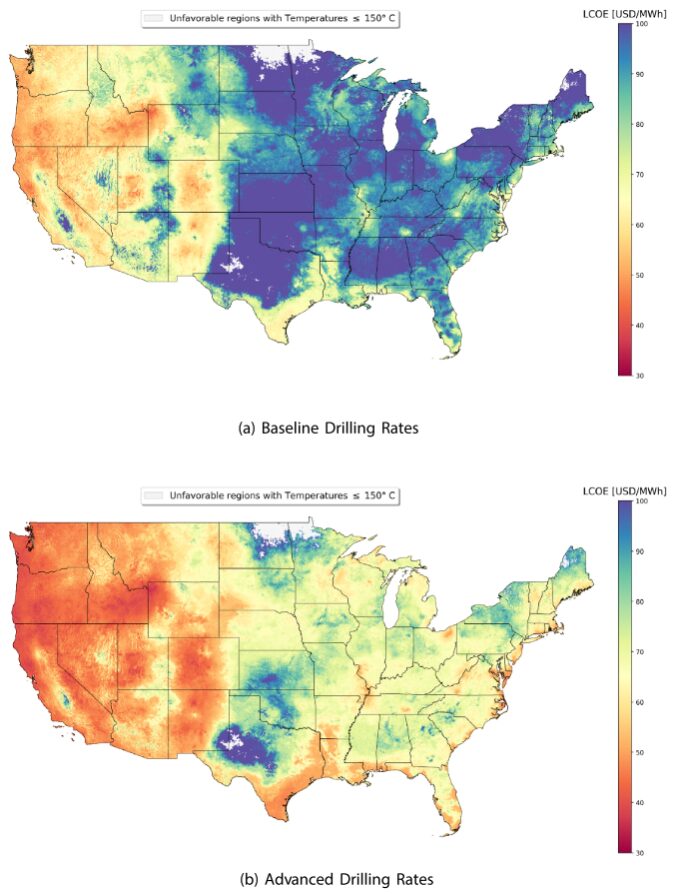 Aljubran and Horne found that LCOE was lowest for nearly 90% of the contiguous U.S. by drilling to the deepest point of their studied depth (i.e., 7 km). LCOE was optimized at shallower depths (≤4 km) in a few regions across the western U.S. with high geothermal gradients (e.g., the Snake River Plain or the Great Basin) or where the geothermal gradient becomes more gradual with increasing depth (e.g., western North Dakota). This was attributed to increasing drilling costs with depth that don’t justify the benefit of a higher resource temperature.