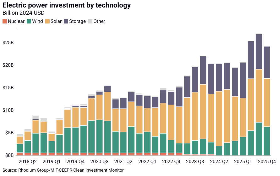 In Q4 2025, Rhodium Group’s data analysis shows $24 billion in actual investments (vs. announced) in clean electricity, with $18 billion in utility-scale solar and storage making up the majority of energy investments. Q4 announced energy investments totaled ~$22 billion across solar ($11.5B), storage ($8.4B), and wind ($2.1B).