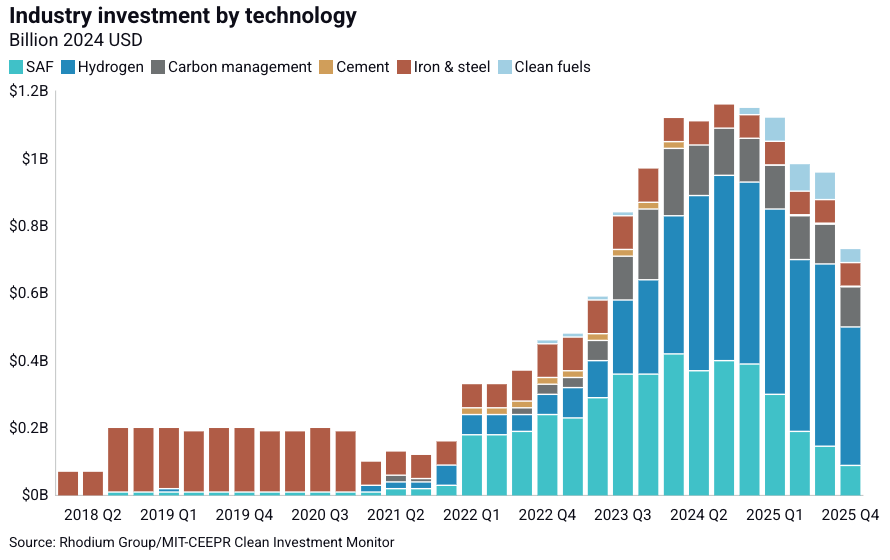 In Q4 2025, Rhodium Group data analysis shows ~$730 million in actual (vs. announced) investments went toward industrial sector projects in Q4. Hydrogen saw the most actual investment (~$410.9M), followed by carbon management ($119 million), sustainable aviation fuel (SAF) (89.1 million), iron & steel ($71.1 million), and clean fuels ($39 million). Q4 announced industry investments totaled ~$445.9 million, all in hydrogen.