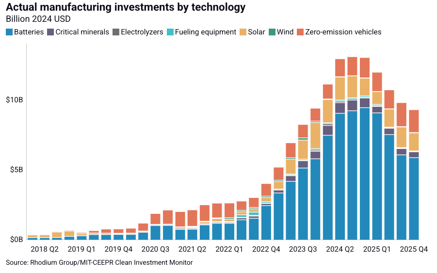 In Q4 2025, Rhodium Group data analysis shows actual manufacturing investment (vs. announced) totaled $9 billion. Battery manufacturing investment, a key part of the EV supply chain, made up the majority of actual investments, totaling $5.9 billion, followed by zero emission vehicles and solar.