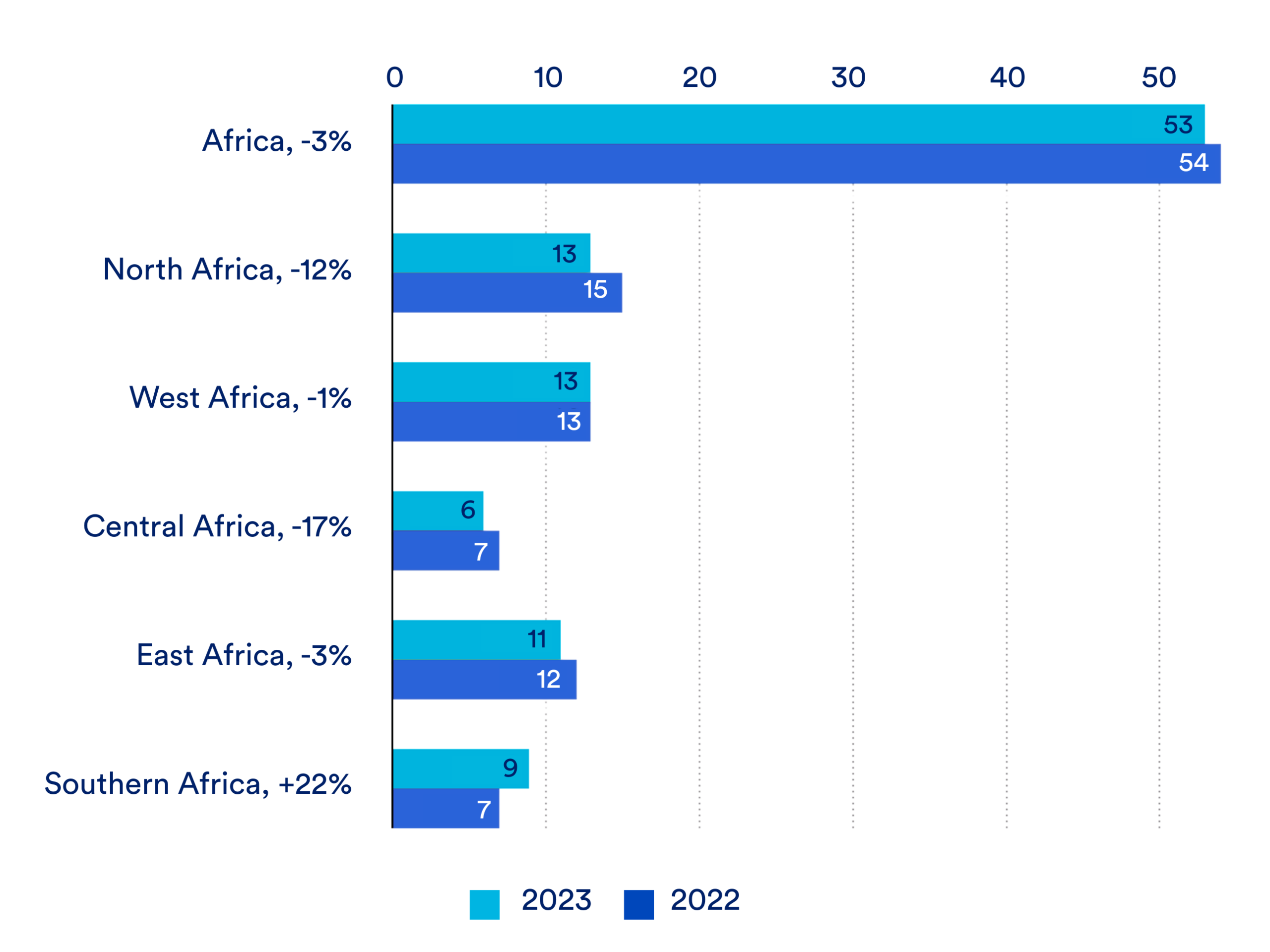 The decline in external public funding underscores the need for Africa to rope in more private capital. But that hasn’t been easy to achieve in the past. Between 2022 and 2023, most regions in Africa saw a drop in foreign direct investment, with a continent-wide decline of 3%. International project finance deals fell by 25% and halved in value.