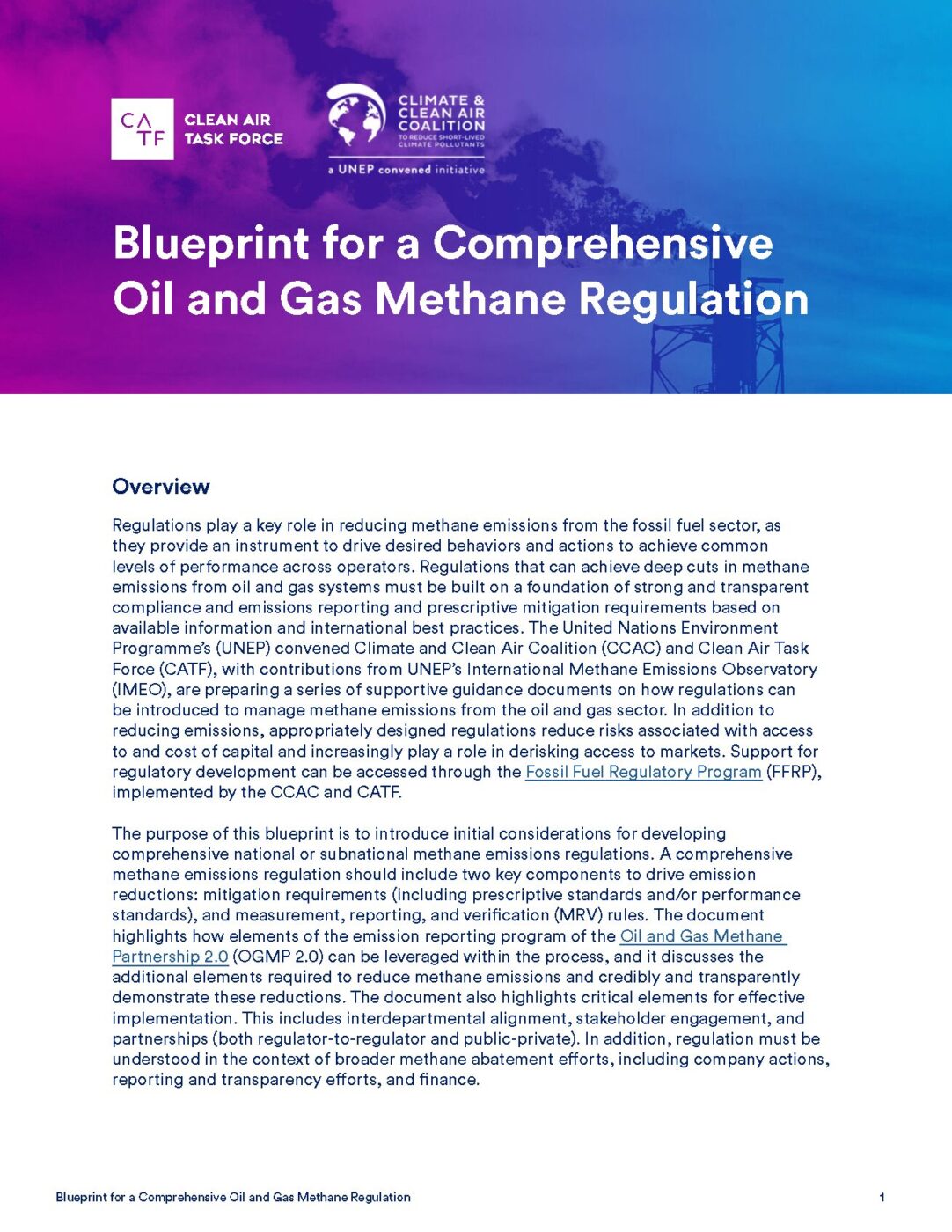 The purpose of this blueprint is to introduce initial considerations for developing comprehensive regulations to reduce methane emissions from the oil and gas industry. Regulations play a key role in reducing methane emissions from the fossil fuel sector, as they provide an instrument to drive desired behaviors and actions to achieve common levels of performance across operators. Regulations that can achieve deep cuts in methane emissions from oil and gas systems must be built on a foundation of strong and transparent compliance and emissions reporting and prescriptive mitigation requirements based on available information and international best practices.
