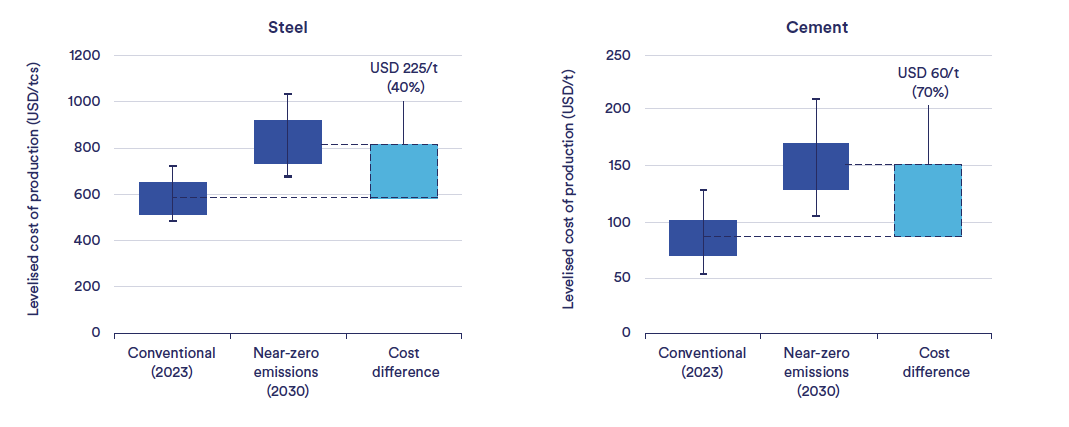 Figure 1. The levelised cost of production for near-zero emissions cement and steel, compared with unabated conventional production.2