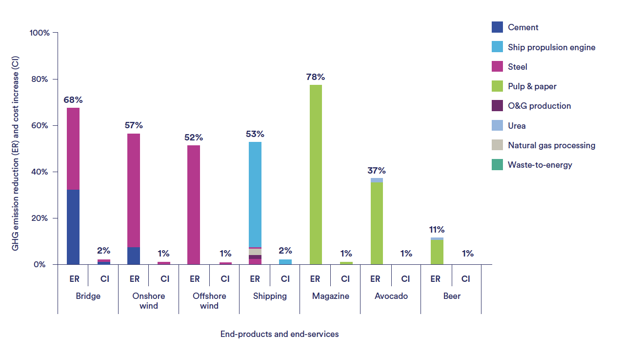 Figure 2. Relative cost increases and emissions reductions for a selection of products decarbonised using CCS10