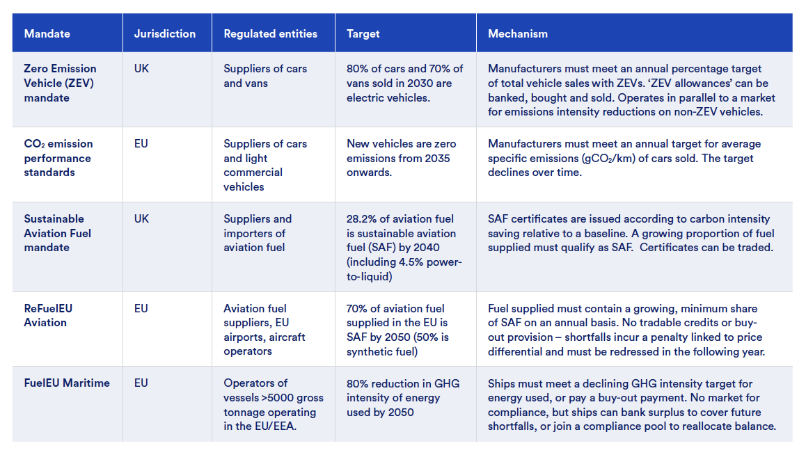 In recognition of the need for additional regulatory drivers to support carbon pricing, the EU and other jurisdictions have implemented mandates for the decarbonisation of hard-to-abate transport sectors such as shipping and aviation (Table 1). These mandates complement carbon pricing and incentivise more targeted sectoral transformation with a clear decarbonisation trajectory, and even the scale up of specific technologies.