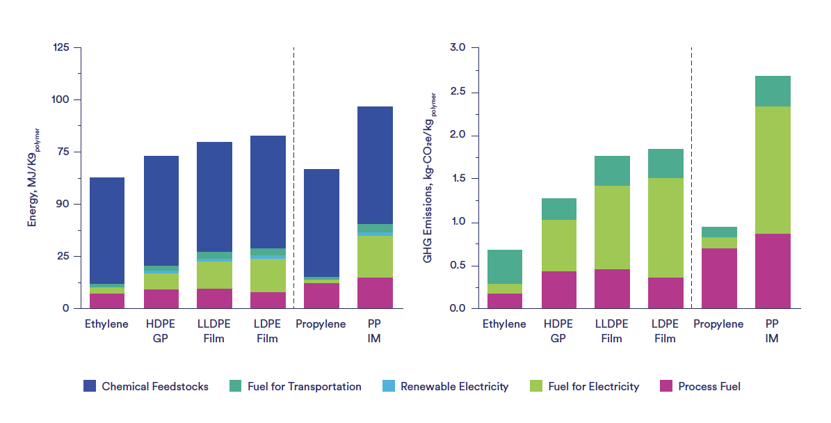Figure 6. Energy consumption and greenhouse gas emissions for polyethylene and polypropylene and their constituent monomers (ethylene and propylene respectively). (IM: injection moulded, GP: general purpose).43