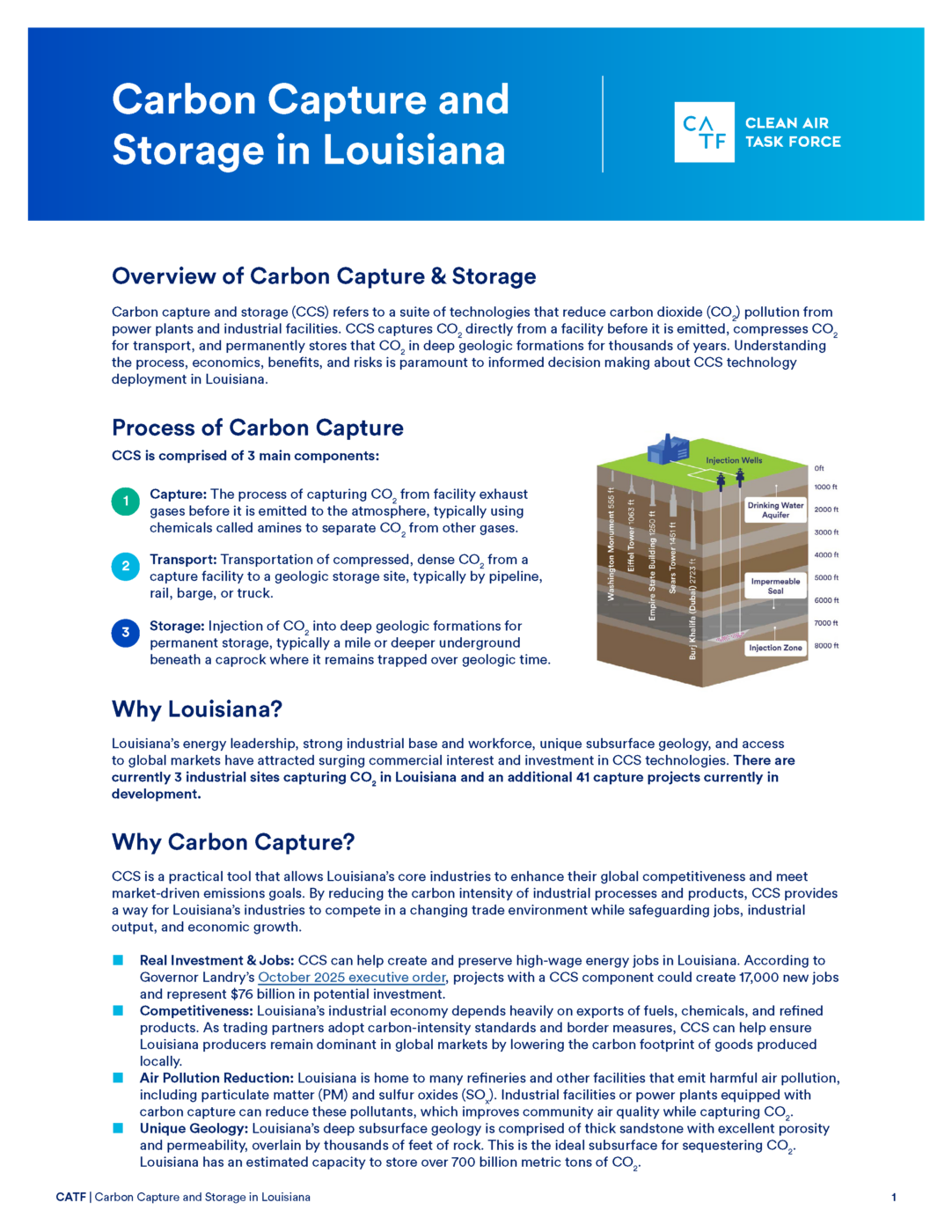 Carbon capture and storage (CCS) refers to a suite of technologies that reduce carbon dioxide (CO2) pollution from power plants and industrial facilities. CCS captures CO2 directly from a facility before it is emitted, compresses CO2 for transport, and permanently stores that CO2 in deep geologic formations for thousands of years. Understanding the process, economics, benefits, and risks is paramount to informed decision making about CCS technology deployment in Louisiana.