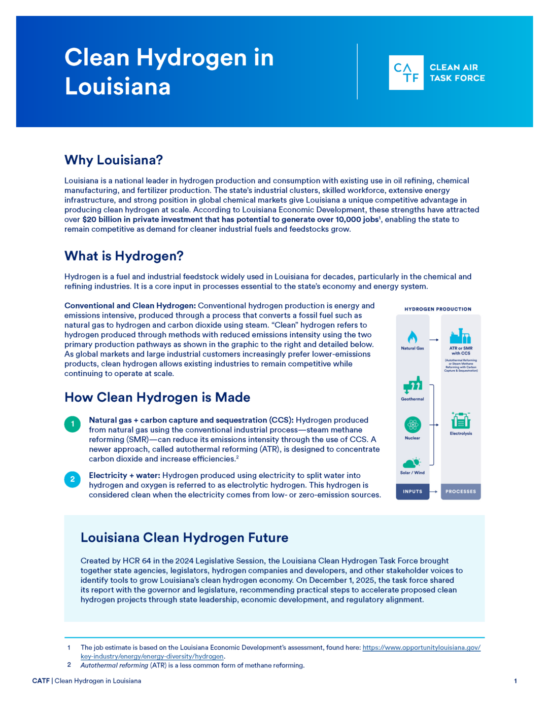 Louisiana is a national leader in hydrogen production and consumption with existing use in oil refining, chemical manufacturing, and fertilizer production. The state’s industrial clusters, skilled workforce, extensive energy infrastructure, and strong position in global chemical markets give Louisiana a unique competitive advantage in producing clean hydrogen at scale. According to Louisiana Economic Development, these strengths have attracted over $20 billion in private investment that has potential to generate over 10,000 jobs, enabling the state to remain competitive as demand for cleaner industrial fuels and feedstocks grow.