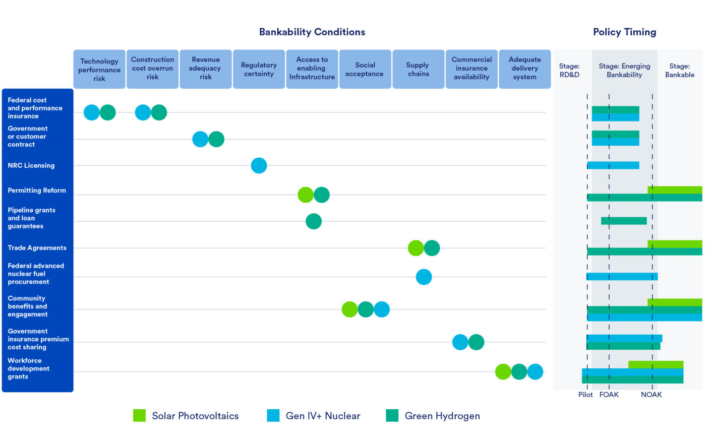 Risks and mitigation strategies will change along development pathway, and the timing and shape of policy interventions must evolve in response. For example, for advanced nuclear and green hydrogen, most policy interventions should occur during emerging bankability to address early-stage technology risks, whereas for solar PV that has already achieved systemic bankability, policy interventions would more likely to be required to focus on maintaining or reestablishing enabling conditions to enable deployment at scale.
