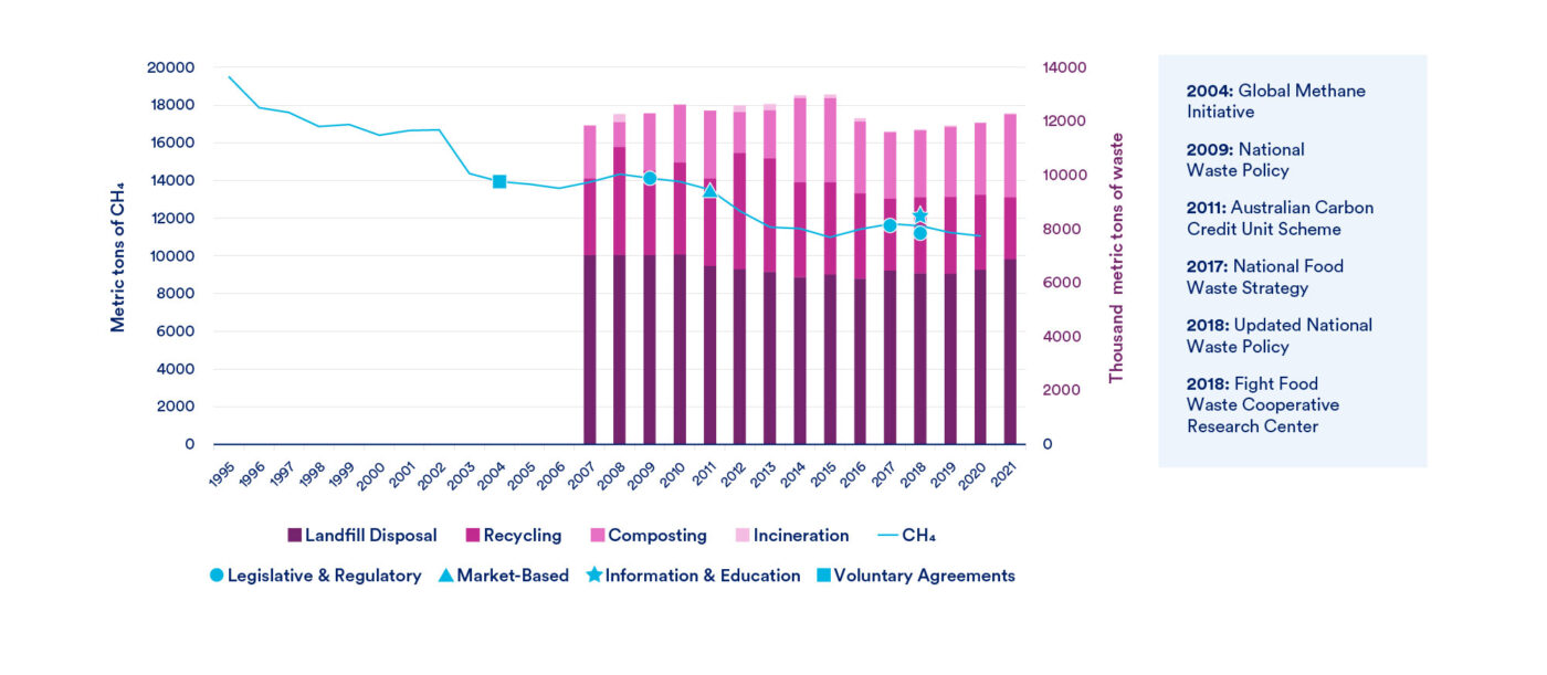 - Legislative and Regulatory: Australia’s first national framework for managing waste was The National Strategy for Ecologically Sustainable Development (ESD). This strategy provided the guiding principles for the efficient use of resources and responsible disposal of waste. Australia did not have a waste-sector-specific national policy until 2009, with the introduction of the National Waste Policy. This policy builds on the National Strategy for ESD by setting goals, strategies, and responsibilities for reducing waste generation, increasing recycling, and minimizing the environmental impacts of waste disposal by 2020. In 2018, the Australian government updated the National Waste Policy, which sharpens the country’s focus on a circular economy and extends targets to 2030. Beyond a broad waste policy, Australia introduced a National Food Wase Strategy in 2017 with priority areas and approaches for reducing food loss and waste.